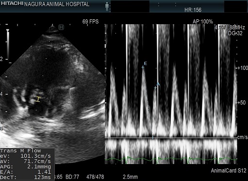 基本的に重症度は心臓エコー検査により判断します。心房の大きさ、左室流出路の血流の速さ、左心室内腔の大きさ、三尖弁逆流や肺高血圧などの有無を確認し、薬の選択をします。お薬の投薬で安定していれば良いですが、発咳や呼吸促拍などがあり落ち着かない状態の場合は、こまめに検査をする必要があります。ただし、検査の際に暴れてしまったり、落ち着いて検査が受けられない子の場合には、検査も負担になりますので簡易的にチェックするのみとなる場合もあります。