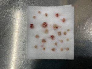 シュウ酸カルシウム結石である場合は、食事による溶解が望めないため、外科手術による摘出が一般的です。