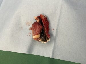 今回は、術後の顔の変形や食事ケアを考慮し、反対側の下顎犬歯を残してギリギリ切除となりました。再発が心配されます。